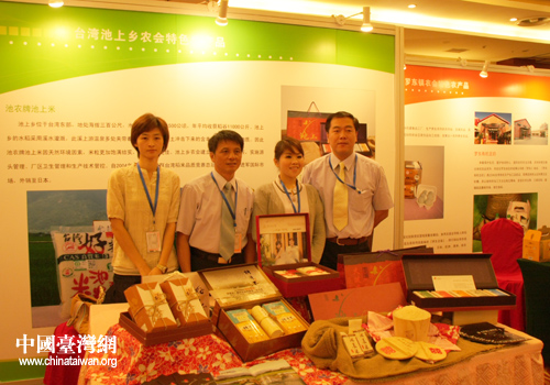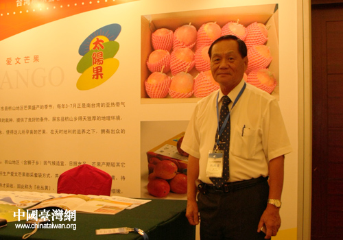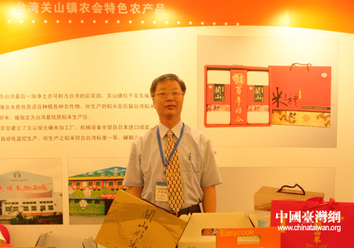 臺灣屏東縣枋山地區農會總干事在展臺旁留念(中國臺灣網 劉凱 攝)