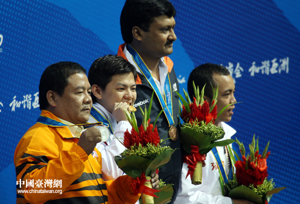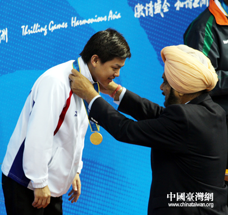 中華臺北選手郭柏成摘得廣州亞運會男子美式8球單打金牌。圖為郭柏成領獎。(中國臺灣網 鐘寶華 攝)