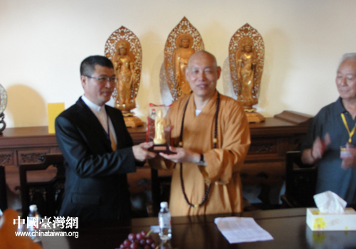臺(tái)灣金蘭會(huì)會(huì)長臺(tái)南正統(tǒng)鹿耳門圣母廟主委王增榮與普陀山佛教協(xié)會(huì)會(huì)長道慈大和尚代表雙方互換禮物(圖片來源:舟山市臺(tái)辦)