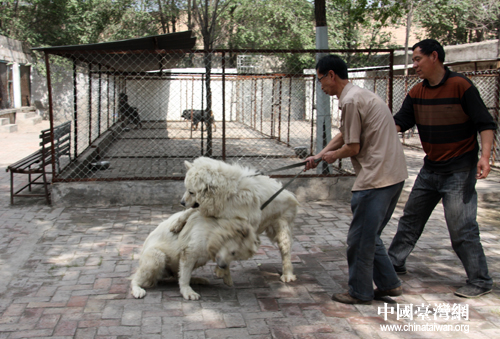 藏獒生性兇猛,圖為養(yǎng)殖人員手牽的兩只藏獒打在一起。(中國臺灣網(wǎng) 楊云濤攝)