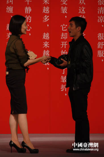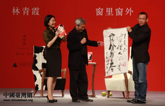 姜文、徐克為林青霞送上二人親筆題字“窗里人間事,窗外林上春”。(中國臺灣網(wǎng) 李丹 攝)