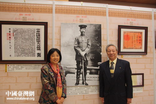 兩位臺胞在投身辛亥革命的先輩像前合影留念。(中國臺灣網 楊麗 攝)