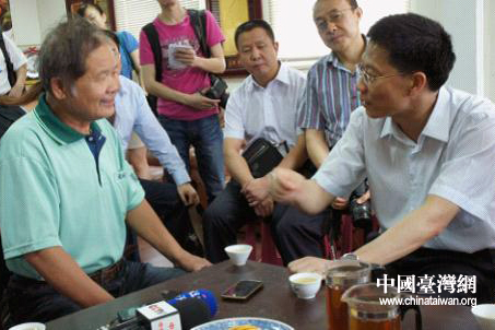 四川省委常委、副省長鐘勉(右一)在臺灣桃園縣龍?zhí)多l(xiāng)參觀考察,與三水村茶農(nóng)廖文金(左一)拉家常。