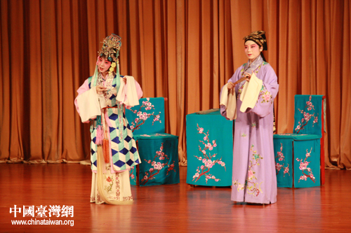 正在臺上表演《玉簪記·琴挑》的李念潔(左)。(中國臺灣網 孟雅詩 攝)