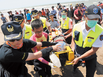 新北市淡水沙侖海域失蹤的學(xué)生昨天相繼尋獲,吳翊庭被救起時(shí)已無生命跡象,但救護(hù)人員仍不放棄搶救。 (圖片來源:臺(tái)灣《聯(lián)合報(bào)》)