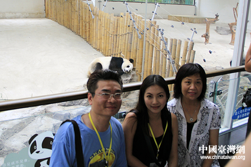 在劉公島海峽兩岸交流基地,臺商們興奮地與大熊貓合影。(中國臺灣網 楊麗 攝)
