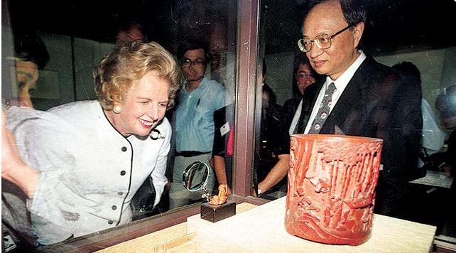 1992年撒切爾夫人(左)訪臺時,曾到臺北故宮參觀。(圖片來自臺媒)