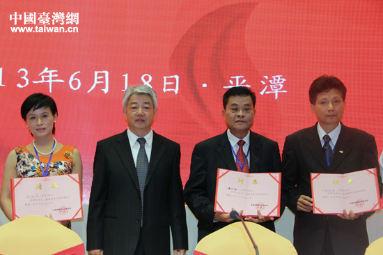 平潭綜合試驗區黨工委委員、管委會副主任趙曉波向擔任協會榮譽職務的兩岸精英頒發聘書。(中國臺灣網 王思羽 攝)