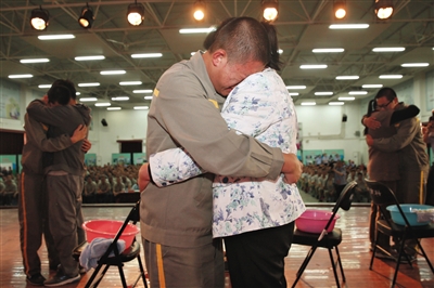 昨日,北京市未成年犯管教所,一名參加成人禮的服刑人員正在給母親洗腳,母親抱著孩子的頭用自己的額頭愛撫。