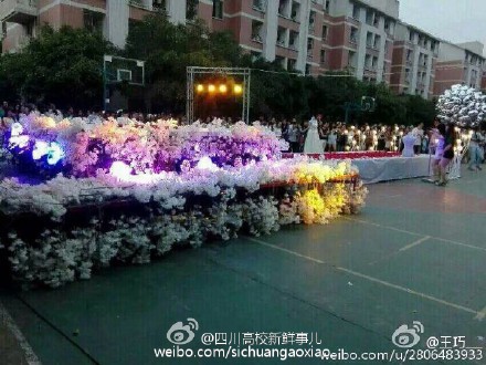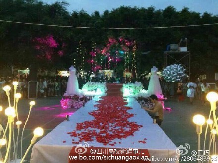 “鮮花、氣球、燈光、玫瑰花瓣,簡直是不能再夢幻了……”昨天晚上8點左右,在內江師院東區籃球場上演了一幕極具浪漫和夢幻色彩的求婚儀式。一位畢業兩年的小伙在他和女友相戀的地方正式向女友伸出愛的橄欖枝,正式向女友求婚。最后女友在全程感動流淚的情況下答應男友求婚。據悉,兩人接下來將根據計劃扯證結婚。