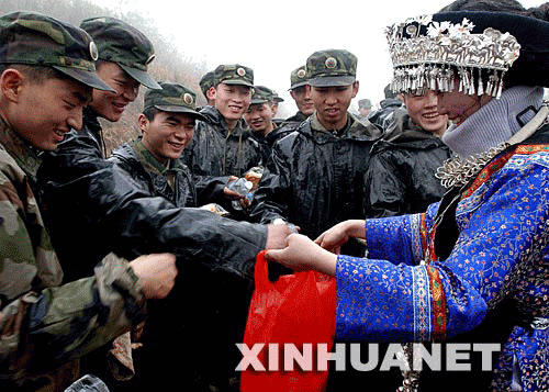 2月17日,當地群眾自發前來慰問解放軍官兵。當日,成都軍區某部百名官兵在貴州省黔東南州三穗縣搶修遭受凝凍災害的青穗輸電主干線。這條線路是三穗縣連接國家電網的主要通道。 新華社發(黃震 攝)