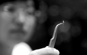 在實驗室中,發掘人員用顯微鏡仔細觀察每一小撥細沙。