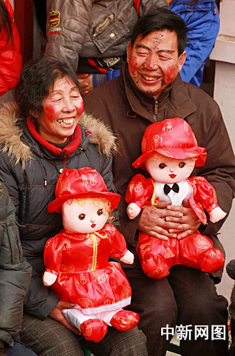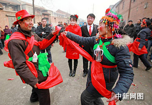 中新網(wǎng)林州1月13日電 (記者 徐華美 通訊員 王子端)2010年1月11日,河南省林州市姚村鎮(zhèn)武家泊村一戶農(nóng)家舉行傳統(tǒng)婚禮。新郎的父親和母親抹著夸張的大花臉,肩背象征多子多福的玩具娃娃,在喧天的鑼鼓和鞭炮聲中,與親戚朋友扭著歡快的大秧歌,迎來(lái)了美麗的兒媳婦。