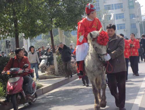 昨日,一場別致的復古婚禮在芙蓉區嘉雨路上演,新郎沒有像其他年輕人用豪華車隊迎娶新娘,而是騎著高頭白馬抬著大紅花轎,把新娘子娶回家。