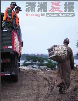 6月23日深夜,在前方記者抵達江西洪災現場時,在憂傷、慌亂、急切的人群里,突然傳來“大家過來領饅頭啊,過來領水喝”的聲音,一輛帶著拖斗的車子上,幾名身穿袈裟的僧人和幾名身著普通服裝的居士不停地給災民們發放食物,慌亂和饑餓的人群頓時安定多了。