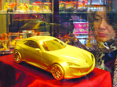 昨天,在南京寶慶銀樓舉辦的金條展上,一輛由純金打造的黃金汽車在南京首次亮相,成為當(dāng)天展會(huì)最大的亮點(diǎn),別小看它只是一個(gè)汽車模型,它可用了足足5公斤黃金,按時(shí)下的金價(jià)計(jì)算,市價(jià)值300多萬(wàn)元呢,一點(diǎn)不比那些真正的跑車便宜。記者在展銷會(huì)上看到,除價(jià)值不菲的黃金跑車外,寶慶銀樓今年還推出了兔年生肖金條、記載祖宗淵源的姓氏金條等特色產(chǎn)品,重量從10克到1.5千克不等。其中,投資金條在上海金交所基礎(chǔ)金價(jià)上每克加價(jià)10元銷售,工藝金條每克加價(jià)15元。(陳春林)