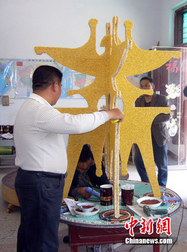 21日上午,記者在王洪均家看到,這座近一人高的“商”字雕塑金光閃閃,頗為壯觀。王洪均一邊忙著用玉米粒粘合“商”字底座,一邊興致勃勃地給記者介紹他的作品。