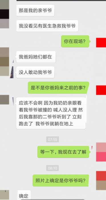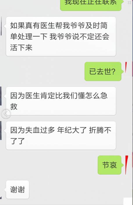 6月22日早上,一名自稱是傷者孫女的女孩與網友聊天的信息公布于眾,女孩稱:她并沒有看到有醫(yī)生急救她爺爺,她爸媽都在現(xiàn)場,是沒有敢動爺爺的。并稱,如果真有醫(yī)生幫及時簡單處理一下,爺爺說不定會活下來。