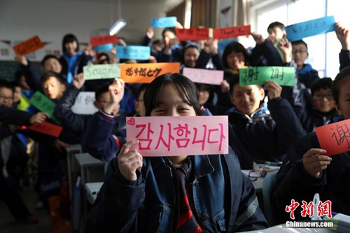 資料圖:鄭州中學生“感恩節”多國語言表謝意。周小云 攝