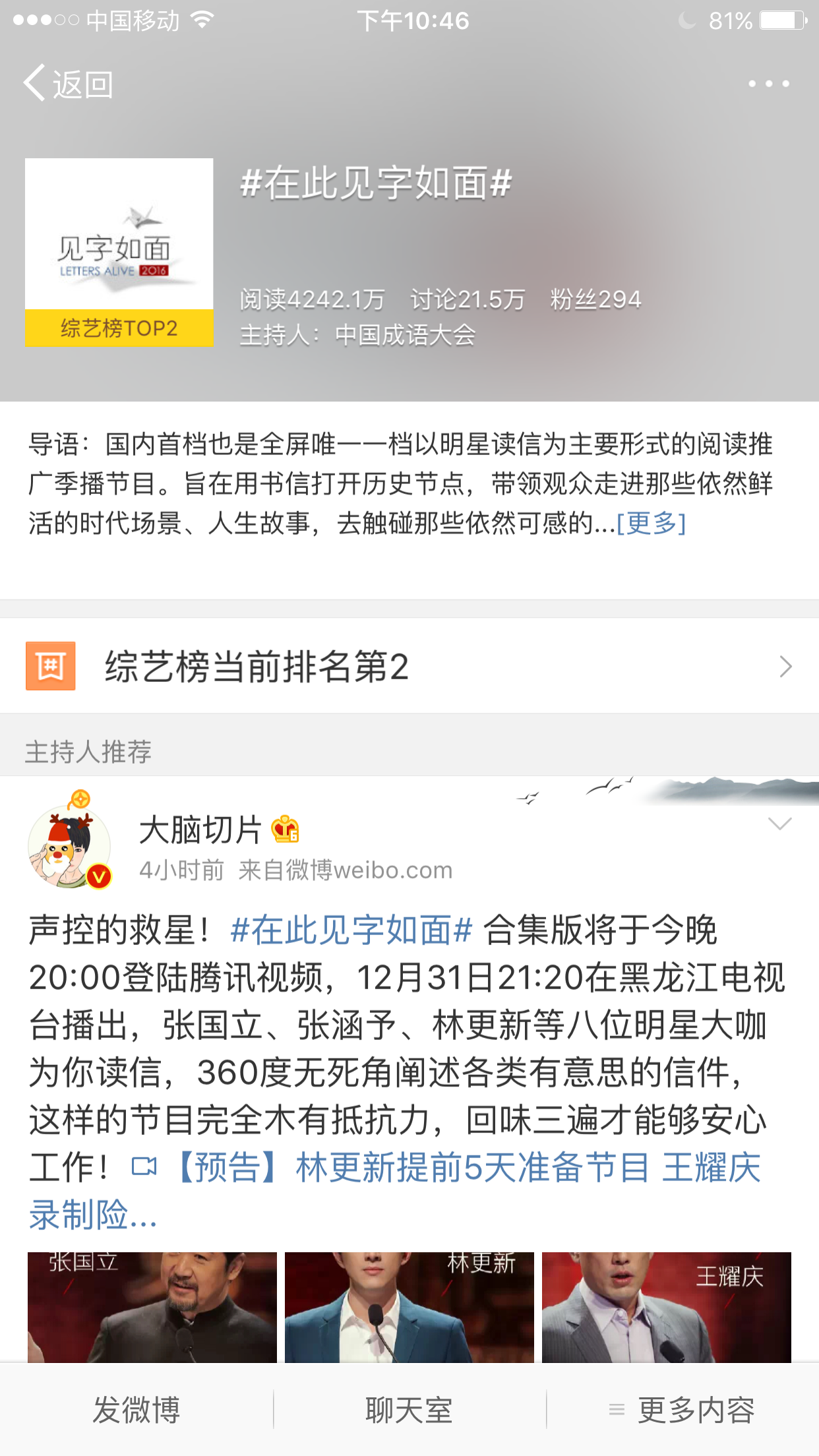 【環球網報道 記者 直欣】2016年12月29日,積聚萬千觀眾期待的純美網綜《見字如面》合集版第一期的在騰訊視頻首播,節目一上線,騰訊視頻的點擊量就突破500萬,主話題#在此見字如面#沖至新浪微博綜藝話題榜第二,節目相關話題閱讀總量已經達到7543萬次。