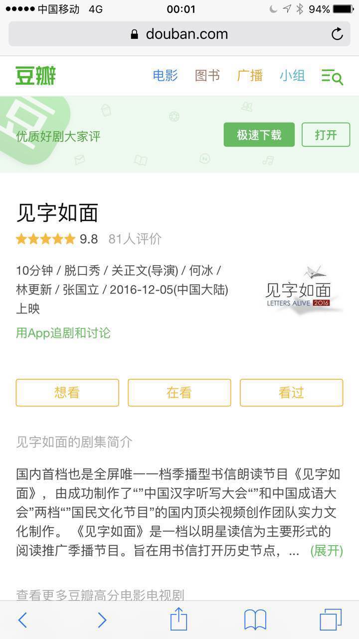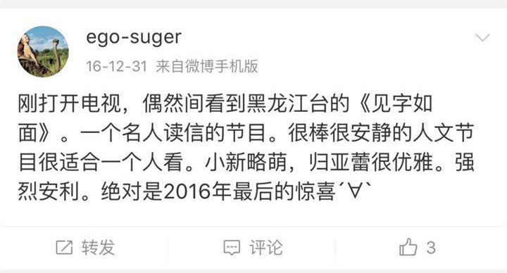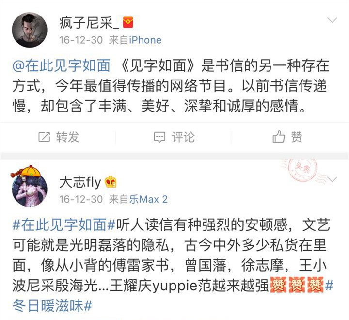 “有質感”,“有內涵”,“錘擊內心”,“第一次看到這樣新穎的節目”,“絕對是2016年最后的驚喜”,“今年最值得傳播的節目”,“在2016年最好的、最有意義的一檔節目”……網友如此評價《見字如面》,并稱這是一檔能夠給人帶來靜謐的節目,“可以讓人思考、自修“,并讓人“突然覺得好像互聯網之外的中國是個不一樣的中國啊”。