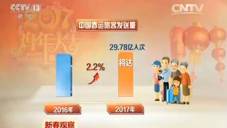 中國雞年春節(jié)七天假期,帶動(dòng)的是40天的大遷徙。國家發(fā)改委、交通運(yùn)輸部等部門預(yù)測,2017年中國春運(yùn)旅客發(fā)送量將達(dá)29.78億人次,同比增長2.2%。其中,道路25.2億人次,增長1%;鐵路3.56億人次,增長9.7%;民航5830萬人次,增長10%;水運(yùn)4350萬人次,增長2%,近十年春運(yùn)交通數(shù)據(jù)幾乎年年創(chuàng)新高,說明春運(yùn)規(guī)模在逐年擴(kuò)大。