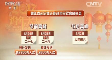中國各地的火車站、長途客運(yùn)站以及飛機(jī)場等,在巔峰時(shí)刻成為世界上人口最密集的地方之一。雞年春運(yùn)總體遷徙趨勢呈雙高峰形態(tài),1月24日(臘月二十七)、25日(臘月二十八)為節(jié)前高峰,而2月2日(大年初六)則為節(jié)后遷徙高峰;預(yù)計(jì)24號(hào)發(fā)送旅客總量超8300萬人次;預(yù)計(jì)25日鐵路、公路、民航、水路日發(fā)送旅客總量達(dá)8600萬人次。