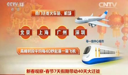 而熱門遷徙火車站、機(jī)場集中在北京、上海、廣州、深圳等一線中心城市,高峰時(shí)段平均每40秒起落一架飛機(jī)。