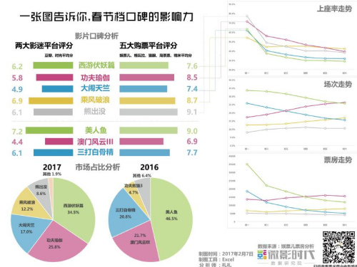 數(shù)據(jù)顯示,雖然今年春節(jié)檔總票房有升高,但是每天的票房都呈下滑趨勢,尤其是初一到初二,從單日8億大幅度滑落到5.8億,其中下跌最快的是《西游伏妖篇》和《大鬧天竺》,相對表現(xiàn)穩(wěn)定的是《功夫瑜伽》,逆襲成功的是《乘風(fēng)破浪》。