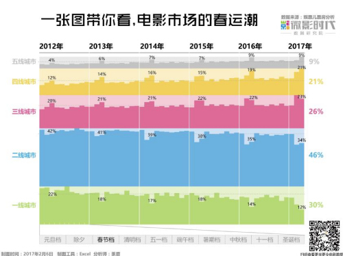 在中國人眼中,團(tuán)圓是春節(jié)的符號,因此今年春節(jié)檔全國票房的區(qū)分也備受春運(yùn)影響。微影數(shù)據(jù)研究院數(shù)據(jù)顯示,近5年來,一、二線城市春節(jié)檔票房明顯下降,四、五線城市呈上漲趨勢,三線城市比較穩(wěn)定。