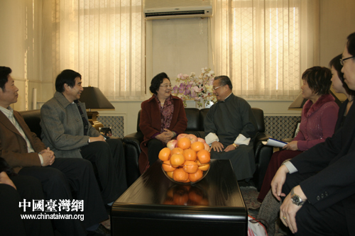 昨天,臺盟中央主席林文漪與臺盟中央副主席黃志賢一行來到位于北京豐臺區的育青食品開發有限公司,為在京臺商代表送上節日祝福,并與臺商們按照臺灣的過年習俗,品嘗了帶有濃郁家鄉風味的棗茶和點心。