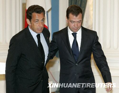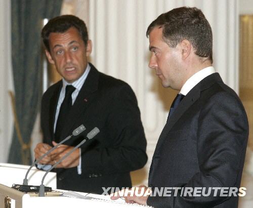 8月12日,俄羅斯總統(tǒng)梅德韋杰夫(右)同法國總統(tǒng)薩科齊在莫斯科出席聯(lián)合新聞發(fā)布會。梅德韋杰夫當天與到訪的法國總統(tǒng)薩科齊就解決南奧塞梯沖突達成包括“放棄使用武力”在內(nèi)的六項原則。梅德韋杰夫說,兩國總統(tǒng)支持將六項原則作為解決南奧塞梯沖突的基礎(chǔ)并呼吁各方接受這些原則。 新華社/路透
