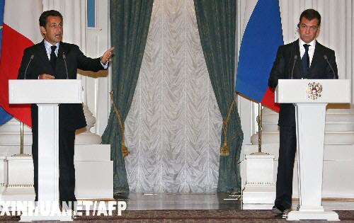 8月12日,俄羅斯總統(tǒng)梅德韋杰夫(右)同法國總統(tǒng)薩科齊在莫斯科出席聯(lián)合新聞發(fā)布會。梅德韋杰夫當天與到訪的法國總統(tǒng)薩科齊就解決南奧塞梯沖突達成包括“放棄使用武力”在內(nèi)的六項原則。梅德韋杰夫說,兩國總統(tǒng)支持將六項原則作為解決南奧塞梯沖突的基礎(chǔ)并呼吁各方接受這些原則。 新華社/法新 |
