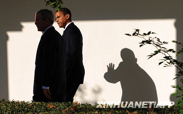 11月10日,美國當選總統奧巴馬(右)應邀進入白宮會見現任總統布什,就經濟危機和伊拉克戰爭等問題舉行會談,以確保政府順利過渡。新華社/法新