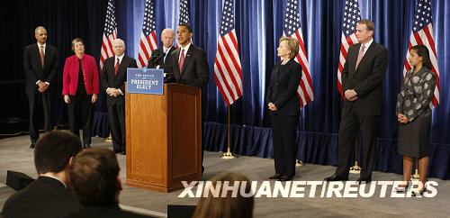 12月1日,美國當選總統奧巴馬(左五)在芝加哥舉行新聞發布會,正式宣布新政府國家安全班子成員名單。奧巴馬提名紐約州國會參議員、前第一夫人希拉里(右三)為新政府國務卿人選,并提名現任國防部長蓋茨(左三)留任。他還提名前海軍陸戰隊司令瓊斯(右二)為總統國家安全事務助理、司法部前副部長霍爾德(左一)為司法部長、亞利桑那州州長納波利塔諾(左二)為國土安全部部長,蘇珊·賴斯(右一)為美國駐聯合國大使。新華社/路透