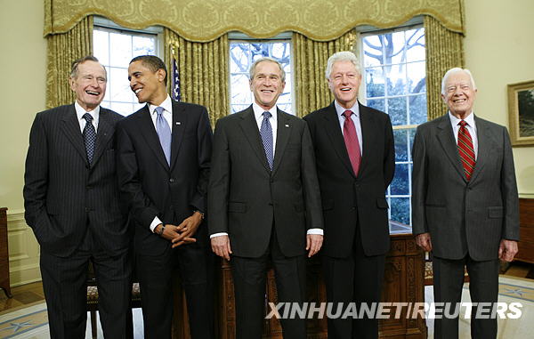 1月7日,美國現任總統喬治·W·布什(中)邀請第41任總統喬治·H·W·布什(左一)、當選總統貝拉克·奧巴馬(左二)、第42任總統比爾·克林頓(右二)和第39任總統吉米·卡特在白宮會晤。當日,在著名的白宮橢圓形辦公室內,各位至今健在的美國前總統及現任總統喬治·W·布什,還有當選總統貝拉克·奧巴馬歡聚一堂。這是過去27年以來,美國當選總統、現任總統和前總統在白宮的首次聚會。 新華社/路透