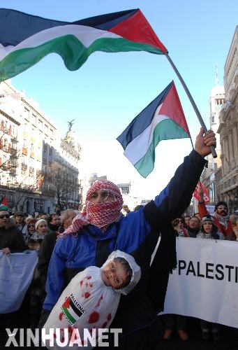 1月11日,在西班牙首都馬德里,一名男子懷抱死難兒童的人偶、高舉巴勒斯坦旗幟參加反戰游行。當日,各界人士在馬德里舉行大規模反戰游行,抗議以色列軍隊在加沙的軍事行動。據組織者稱,共有25萬人參加了此次示威游行。 新華社記者陳海通攝