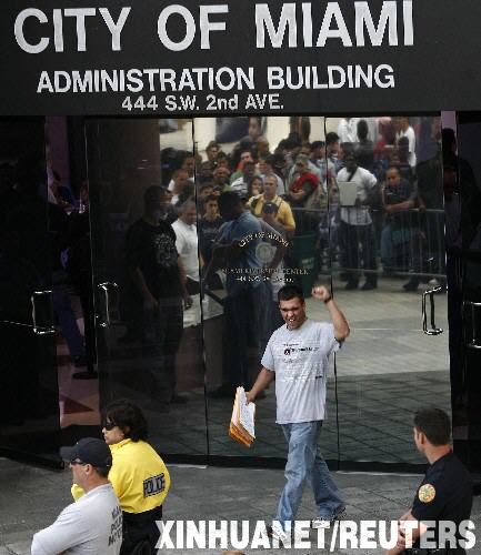 2月2日,在美國佛羅里達(dá)州的邁阿密,一名男子完成申請做消防員的手續(xù)后揮手慶祝。邁阿密市準(zhǔn)備新增35名消防員,并宣布只接受前750人的求職申請表。數(shù)百名申請者為能提交申請表在戶外排隊(duì)露營了三夜。 新華社/路透
