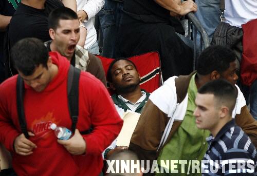 2月2日,在美國佛羅里達(dá)州的邁阿密,一名連夜排隊(duì)等待申請當(dāng)消防員的男子(中)坐在椅子上睡著了。邁阿密市準(zhǔn)備新增35名消防員,并宣布只接受前750人的求職申請表。數(shù)百名申請者為能提交申請表在戶外排隊(duì)露營了三夜。 新華社/路透