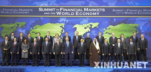 2008年11月15日,中國國家主席胡錦濤在華盛頓出席二十國集團領導人金融市場和世界經濟峰會。這是與會各國領導人及有關國際組織負責人集體合影。新華社記者 李學仁 攝