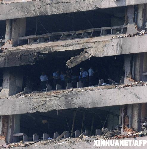 2月21日,在斯里蘭卡首都科倫坡,安全人員在遭到飛機撞擊的稅務部大樓內勘查。科倫坡20日晚遭到反政府武裝泰米爾伊拉姆猛虎解放組織(猛虎組織)空襲,一架猛虎組織飛機被擊落,另一架飛機被擊中后墜落在斯稅務部大樓上。科倫坡國立醫院醫生赫克托·維拉辛哈向媒體稱,空襲導致4人喪生,51人受傷。新華社/法新