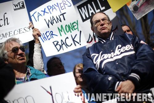 3月21日,在美國康涅狄格州美國國際集團(AIG)總部外,抗議者手舉“納稅人想要回他們的錢”等牌板。當(dāng)天,康涅狄格州一個勞工團體組織金融危機受害者前往AIG總部,抗議AIG在接受美國政府巨額資金援助的情況下仍向部分高管和員工發(fā)放高額獎金。 新華社/路透