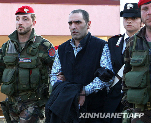 5月10日,在意大利卡拉布里亞地區(qū),當(dāng)?shù)匾粋(gè)黑手黨頭目薩爾瓦托雷·科盧喬(中)被警方逮捕。科盧喬是卡拉布里亞地區(qū)臭名昭著的一個(gè)黑手黨家族頭目,4年前開始逃亡,被列為意大利最危險(xiǎn)的30名潛逃者之一。新華社/法新