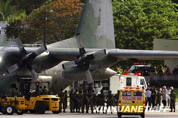 6月13日,一架運載有21具法航失事客機遇難者遺體的巴西空軍飛機抵達巴西東北部城市累西腓。新華社/法新