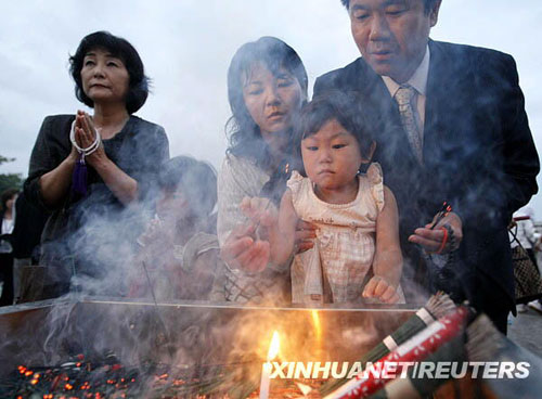 8月6日,在日本廣島和平紀(jì)念公園,一家人為廣島原子彈轟炸的死難者焚香祈禱。新華社/路透