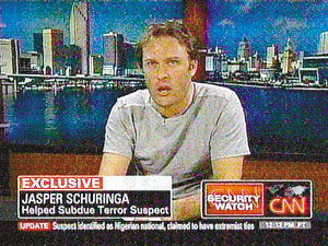 據(jù)加斯帕回憶稱,當(dāng)時他就坐在穆塔拉布后面、靠近飛機(jī)右側(cè)的座位20J。事發(fā)后,他來不及多想,就立即跨過同排其他乘客,跳到過道,飛身朝那名正在燃燒的穆塔拉布撲去!