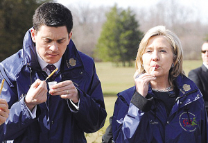 據英國媒體3月31日報道,此次的G8外長會議,各位外長們穿上了尼龍質地的藍色滑雪衫,平常嚴謹有余、活潑不足的各位外長甚至還在鏡頭前“放肆地”大嚼加拿大特產的楓汁太妃糖。不過,最受媒體關注的還是美國國務卿希拉里和英國帥哥外交大臣米利班德。當天,他們在鏡頭前也絲毫沒有半點避嫌的意思。兩人全然不顧及自己的形象,一邊嚼著太妃糖,一邊與對方有說有笑。為此,英國媒體調侃兩人為“外交伉儷”,并特意分別為兩人取名為“小希”和“小米”。