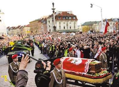 綜合媒體報道,近10萬悲哀的波蘭人18日擁擠在克拉科夫,為波蘭總統卡欽斯基和夫人送葬,盡管火山灰造成歐洲空中交通受阻,導致36國政要無法出席葬禮。