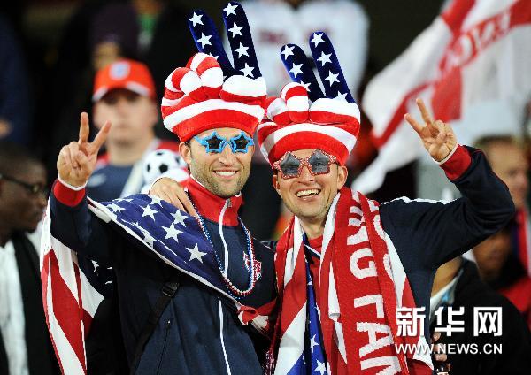 6月12日,兩名美國隊球迷在開賽前。當日,在勒斯滕堡舉行的2010年南非世界杯C組比賽中,英格蘭隊對陣美國隊。 新華社記者郭勇攝