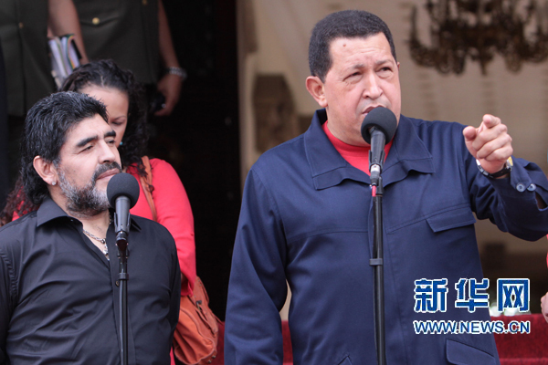 7月22日,在委內瑞拉首都加拉加斯總統府,委內瑞拉總統查韋斯(右)與阿根廷國家足球隊主教練馬拉多納會面。新華社發